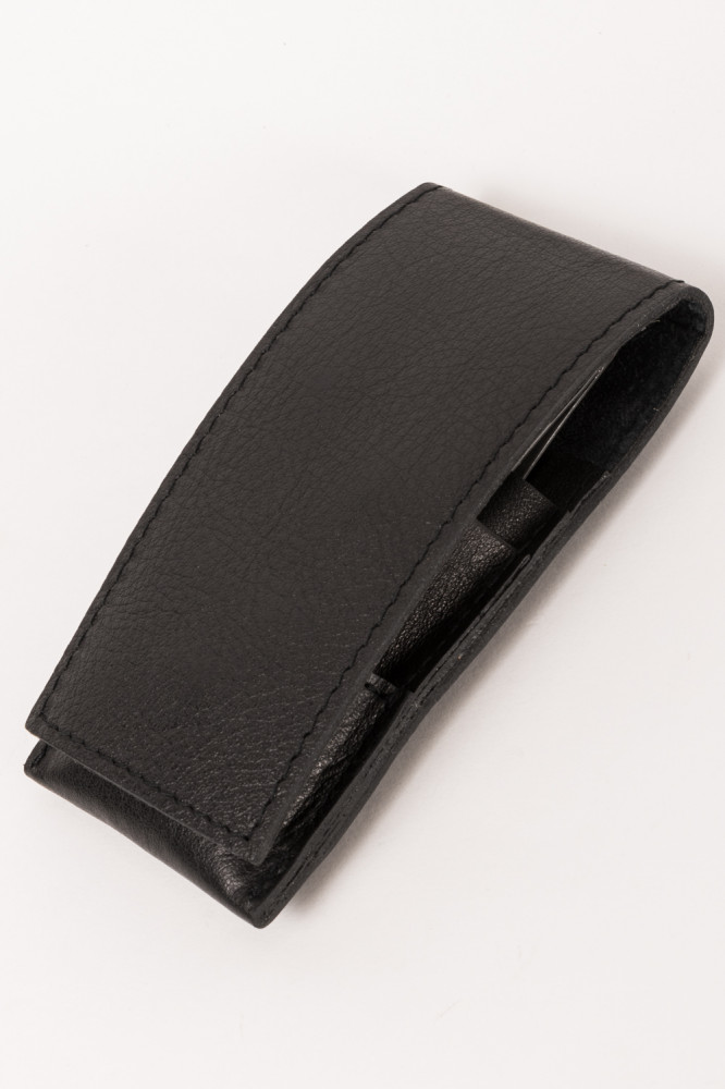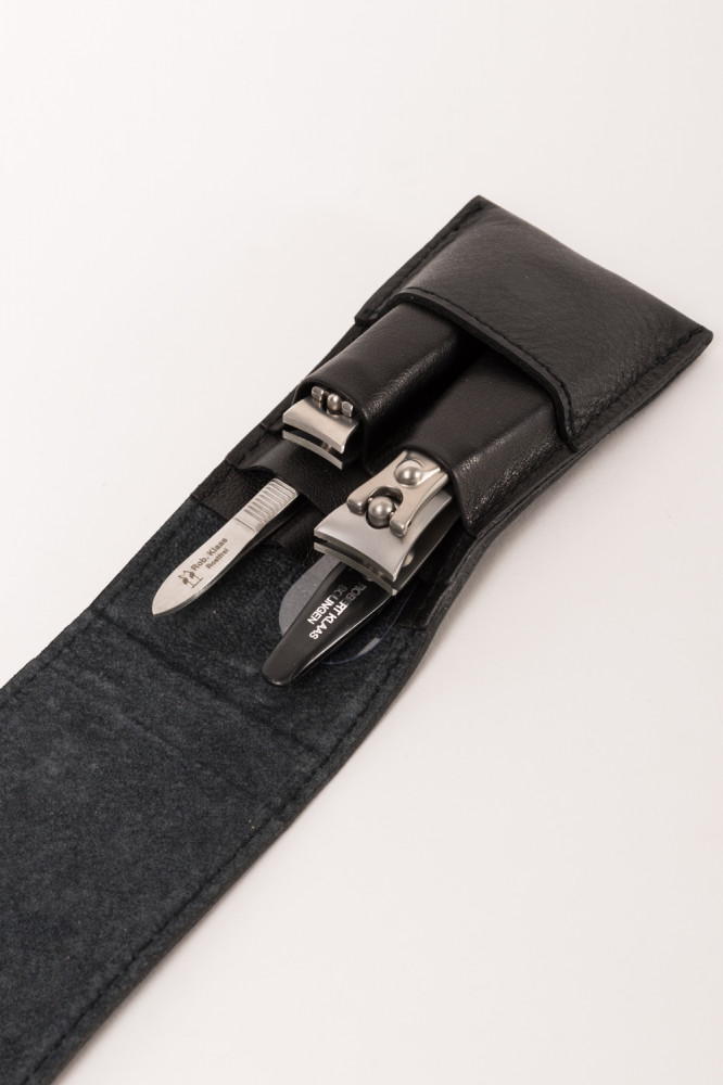 Robert Klaas Solingen rozsdamentes acél Úti manikűrkészlet, Design, fekete bőrtokban.
